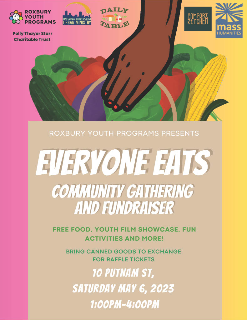 , an event with a focus on food justice, systems, and insecurity. Roxbury Youth Programs presents, "Everyone Eats: Community Gathering and Fundraiser"